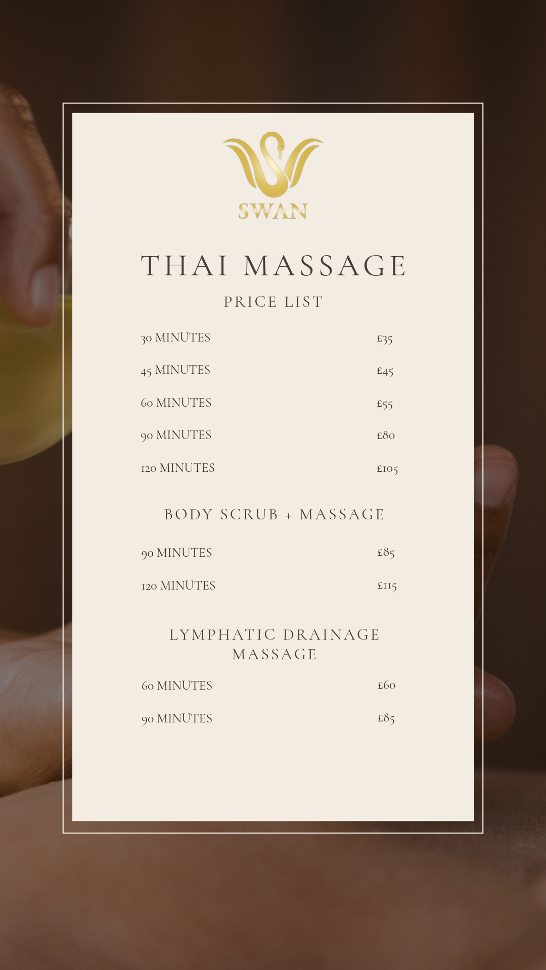 At Swan Thai Massage Matlock, we offer a refined selection of massage treatments designed to suit your individual needs and provide a truly relaxing experience.